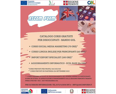 ASCOM FORM rientra nell’elenco di Agenzie accreditate e propone agli interessati corsi di breve e media durata su argomenti diversificati: competenze informatiche, elementi di contabilità, elementi di intelligenza artificiale, corsi per addetti vendita e addetti logistica e magazzino.